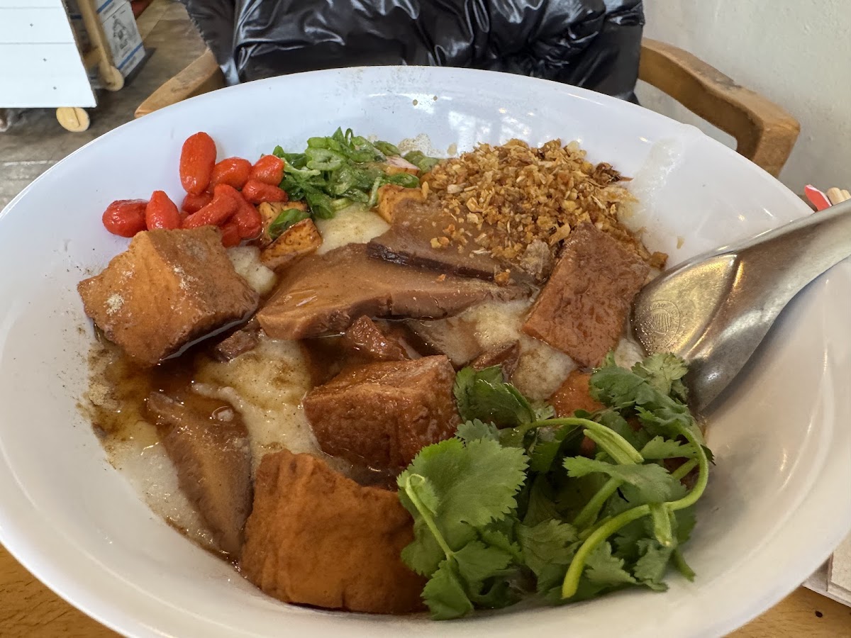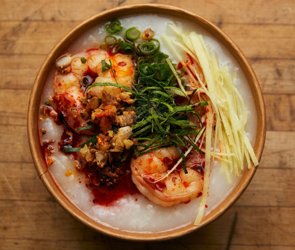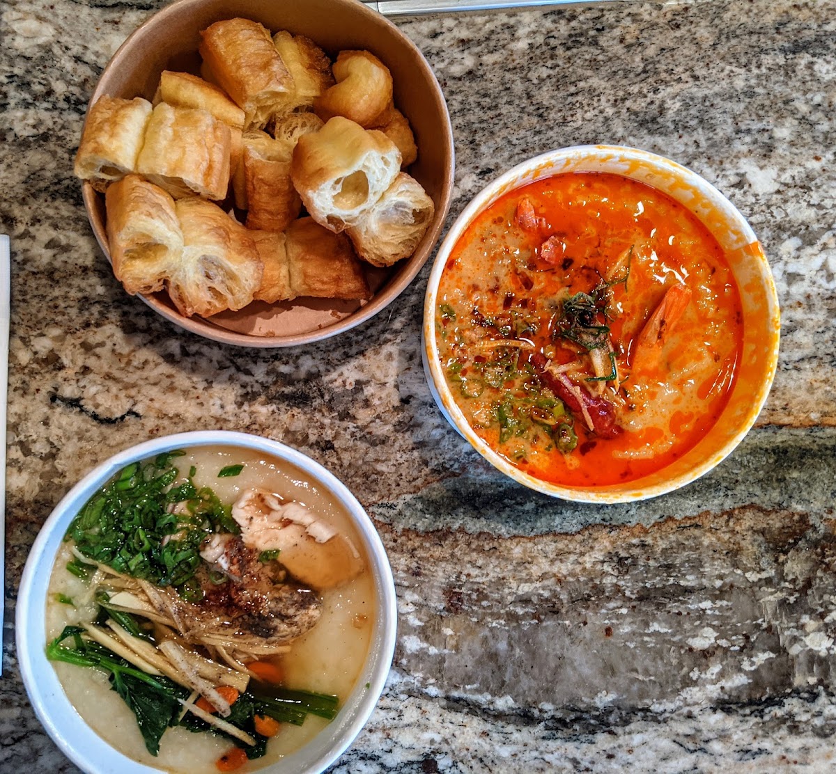 Good food and great location. Simple menu with a handful of options, easy to customize, good protein. Their seafood options are pretty good and generous. The hot soy drink was a nice touch. Got the seafood Tom yum shrimp with soft boiled egg and the crab with century egg congee. The pictures from a year ago looked like they had a better balance of tom yum soup to congee. Mine was not as red. The place was clean and the people were nice. Takeout options available. Overpriced for what it is. Not a lot of space to sit, it's pretty tiny.